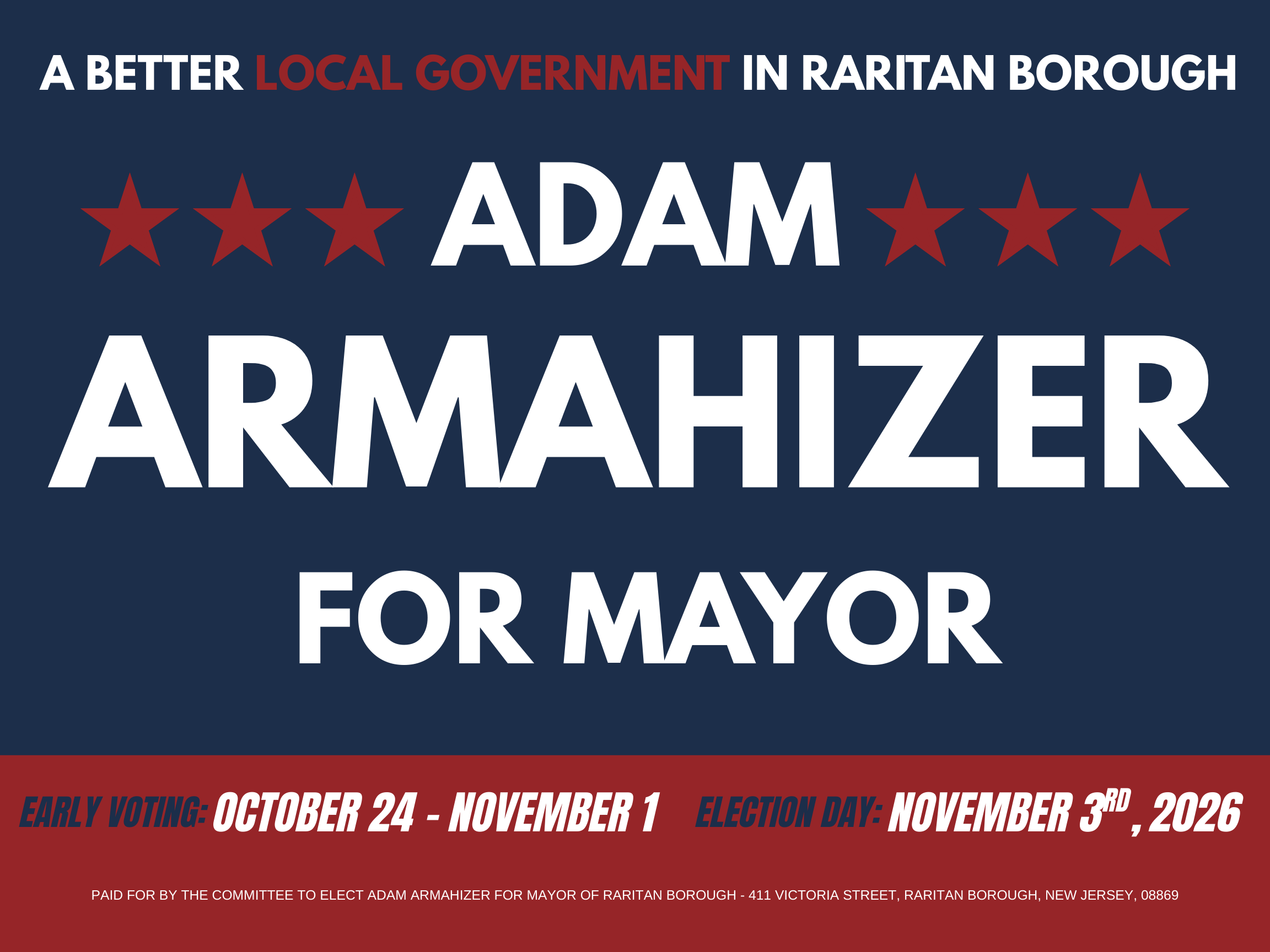 With more than 50% of Raritan Borough being owned by large pharmaceutical corporations and high-density real-estate developers, Adam believes it's time that they PAY THEIR FAIR SHARE. Additionally, reckless and unnecessary spending must be brought under control so taxpayers are no longer forced to shoulder the burden of poor financial decisions. Raritan Borough should focus on exploring new commercial/business revenues, controlling operating costs, improving financial oversight, and stabilizing the budget in order to ensure the Borough operates within its means so that families can afford to stay in Raritan, and seniors can remain in the community they helped build.